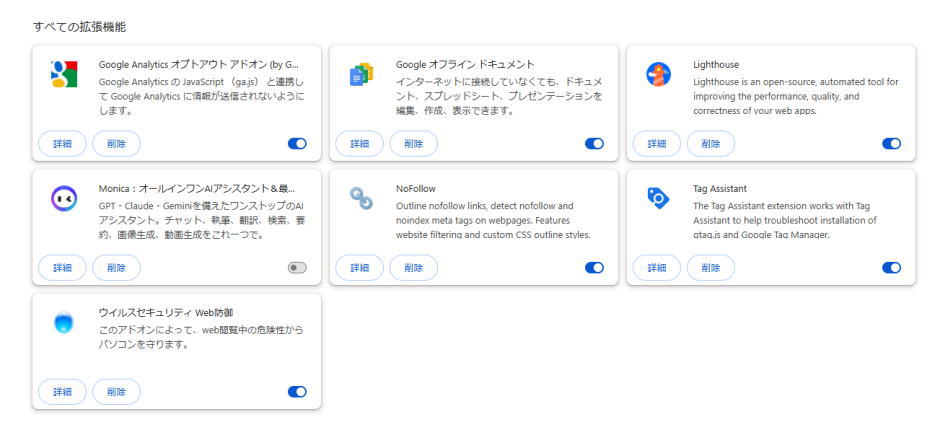 各ブラウザごとに拡張機能の状態を確認しアラート表示している場合はアップデート、もしくは開発終了の場合は削除が必須です。気づきにくい原因なので定期的な確認が必要です。
