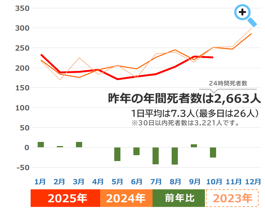 2025年1月からの累計(交通事故日報からの暫定数)で、翌日の午後に発表されています。(土日祝・連休をのぞく)