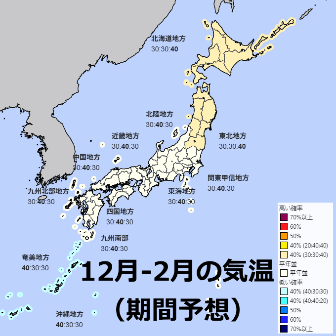 期間全般(12月~2月)の気温予想です。予想通りになった場合は、前シーズンと同じように冬らしい寒さになりそうです。
