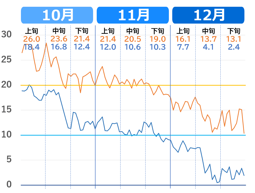 最低気温が10℃未満になる頃は、日中の最高気温は20℃前後です。朝晩は肌寒さを感じるようになります。日中の最高気温が10℃を下回ると冬本番です。